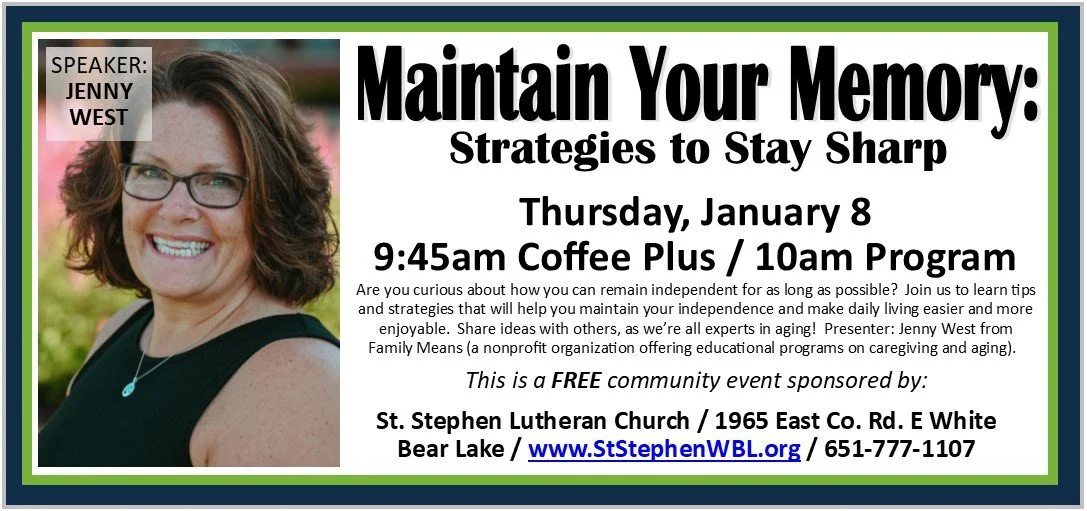 Back to All Events Maintain Your Memory Thursday, January 8, 2026 10:00 AM 11:00 AM St. Stephen Lutheran Church 1965 County Road E E White Bear Lake, MN, 55110 United States (map) Google Calendar ICS